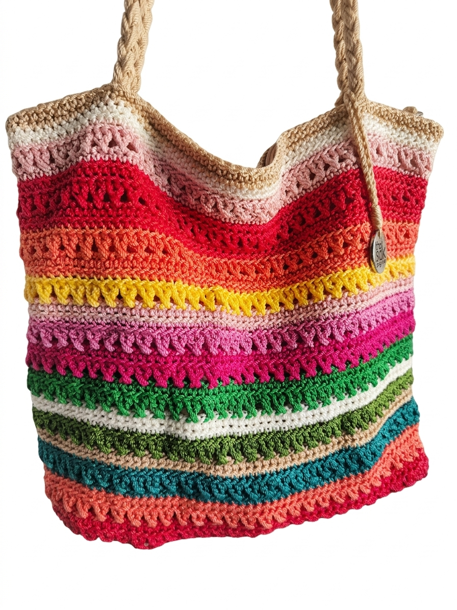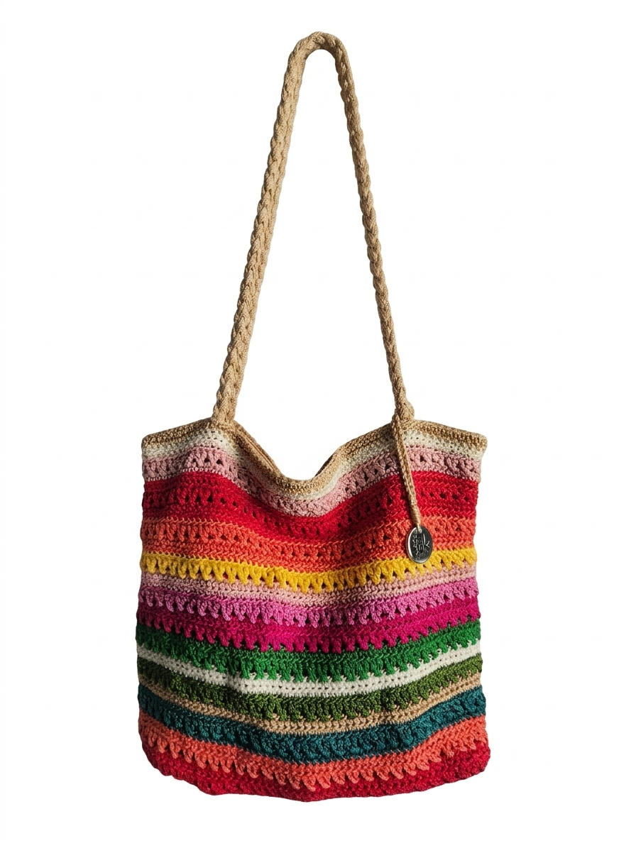Textured Stitching: The bag showcases various crochet patterns, from tight, durable stitches to more decorative, open-work “shell” or “V-stitch” rows that add depth and visual interest.