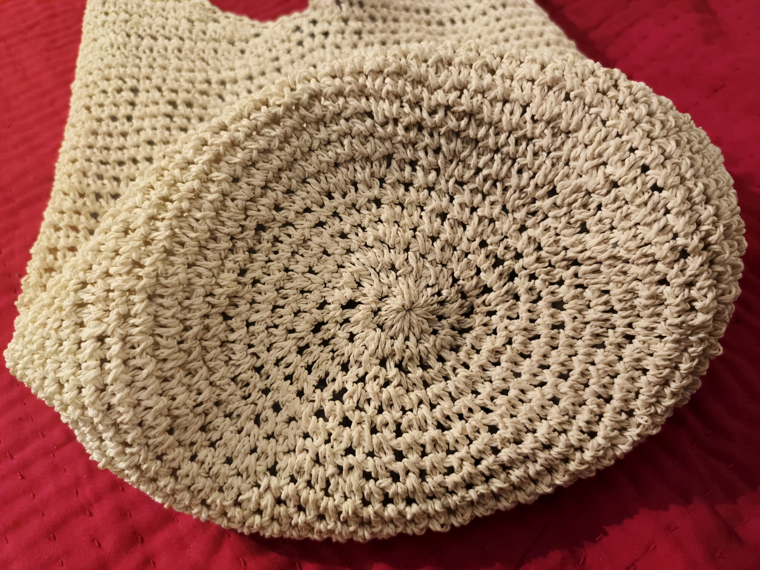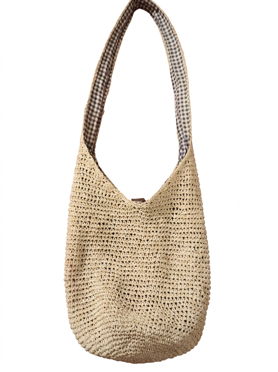 Stitch Work: It features a consistent open-weave crochet pattern. The body uses a breathable mesh-like stitch, while the base (bottom) is worked in a dense, circular spiral to provide extra durability and support for carrying items.