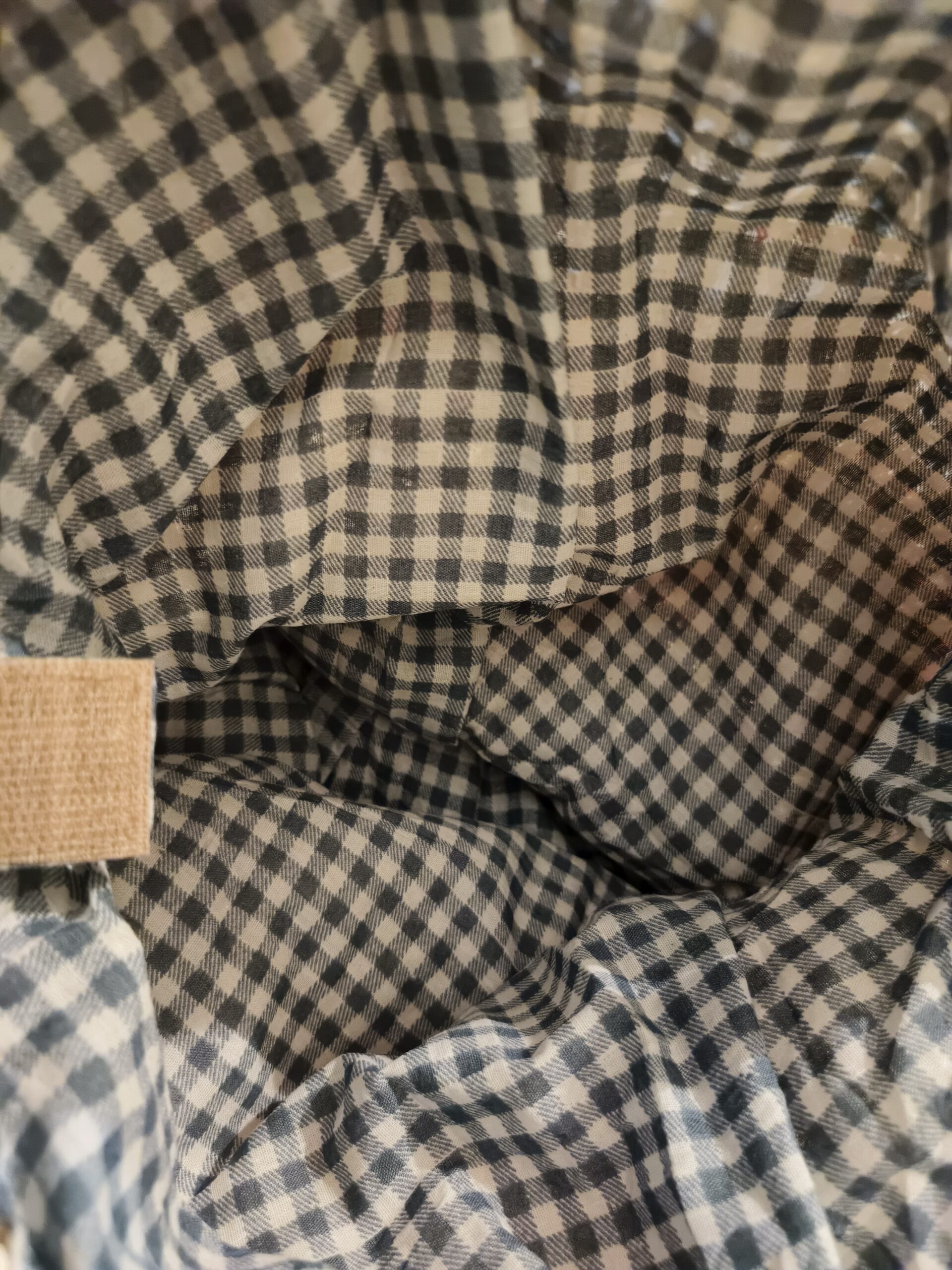Lining: The interior is fully lined with a black and white gingham (checked) fabric, providing a sharp, stylish contrast to the neutral cream exterior.