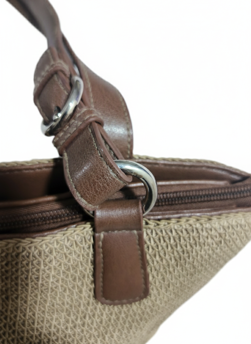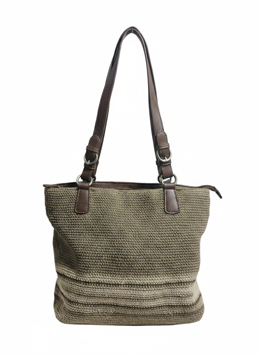 Crafted with a sophisticated textured knit exterior, this bag features a beautiful earthy taupe tone that pairs effortlessly with any outfit. The structured yet flexible body provides ample space for your essentials, while the durable faux-leather straps in deep cocoa brown offer comfort and a premium feel.