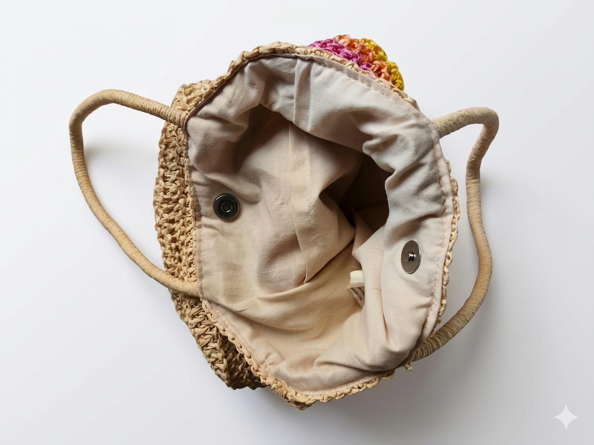 Secure Interior: The inside is fully lined with a cream-colored fabric to keep smaller items from slipping through the weave. It includes a magnetic snap closure to keep your belongings secure.