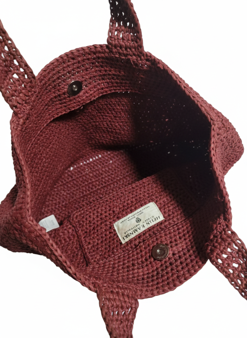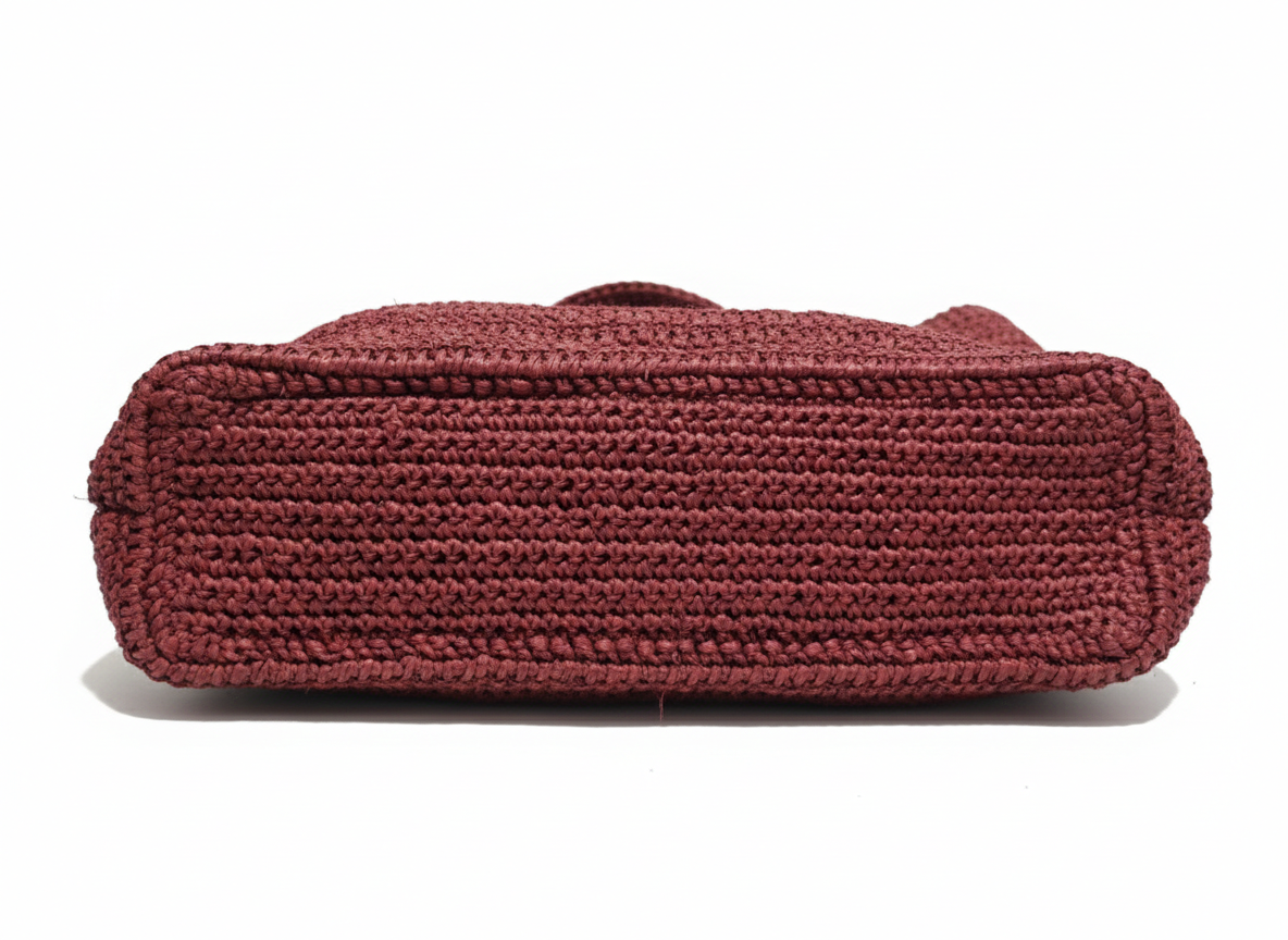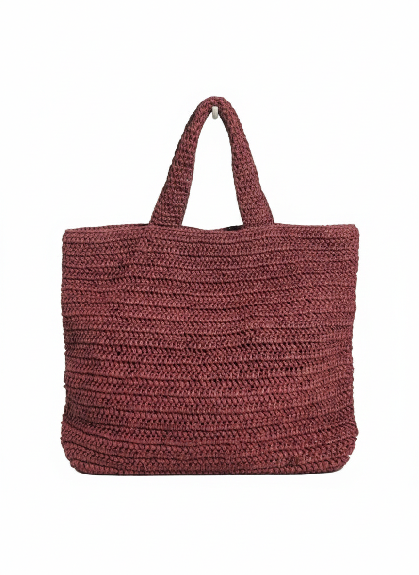 The bag is expertly crocheted by hand using high-quality raffia fibers. The weave features a consistent, tight stitch pattern that provides structure while maintaining the natural, organic flexibility typical of raffia. The deep burgundy dye gives the natural fiber a sophisticated, elevated look.