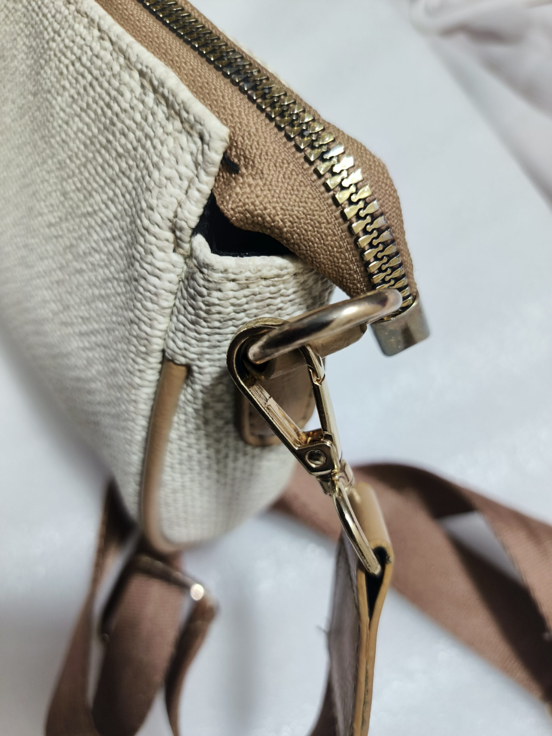 ​Trim: It is accented with tan faux-leather piping and detailing that frames the bag’s structured silhouette.
