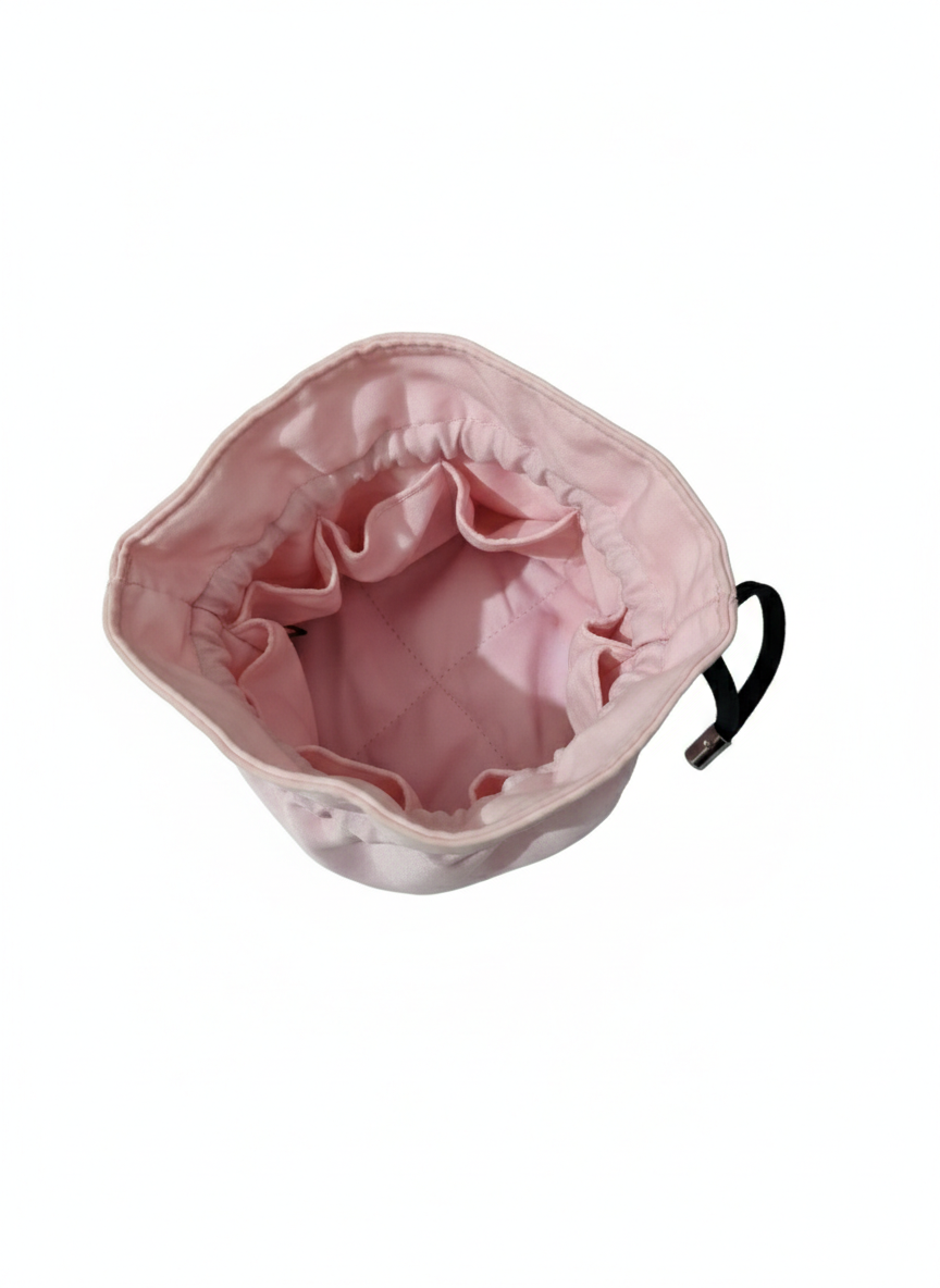 This is a drawstring bucket-style hand size pouch, designed primarily as a travel makeup bag or a jewelry organizer. It combines a soft, feminine aesthetic with a highly functional interior.